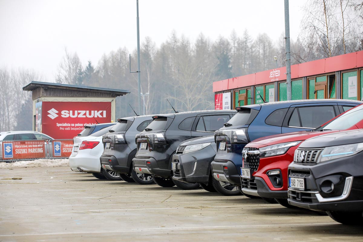 Suzuki parking, který celoročně zajišťuje Suzukářům ta nejlepší parkovací místa zdarma, se během chvíle zaplnil účastníky z různých koutů republiky - od místních Liberečáků až po ty, kteří za zimními zážitky vážili cestu z větší dálky.